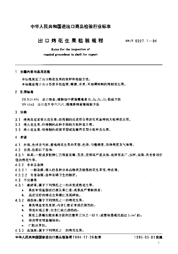 SN/T 0327.1-1994 出口烤花生果检验规程
