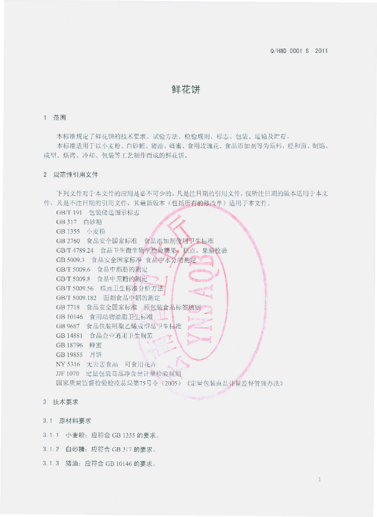 Q/HWD 0001S-2011 鲜花饼