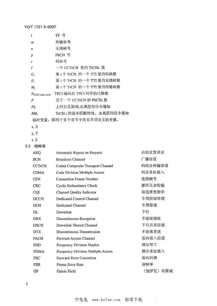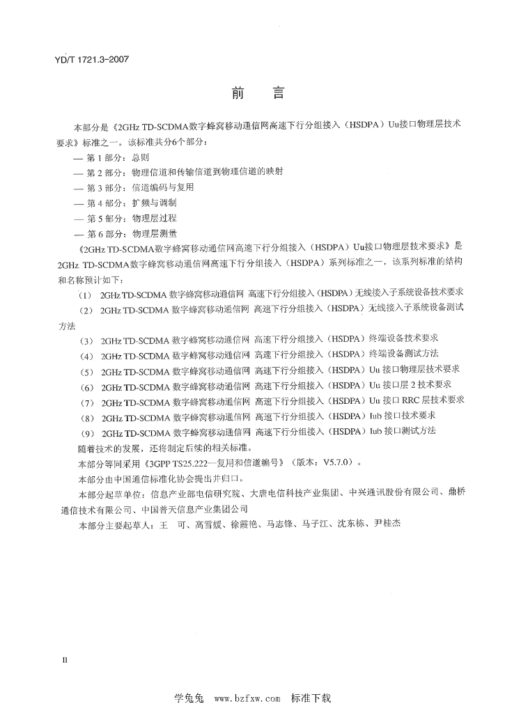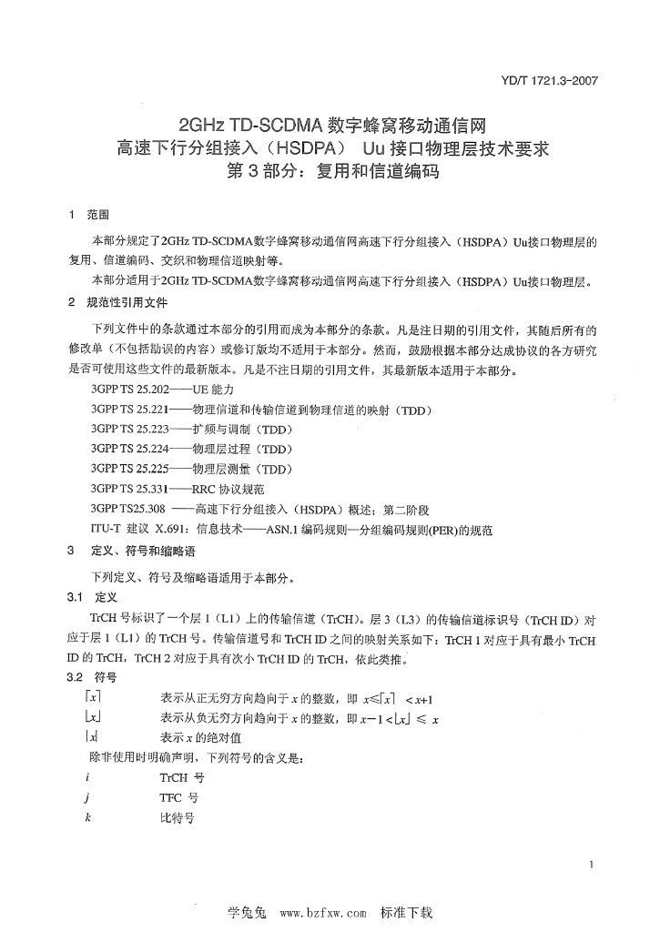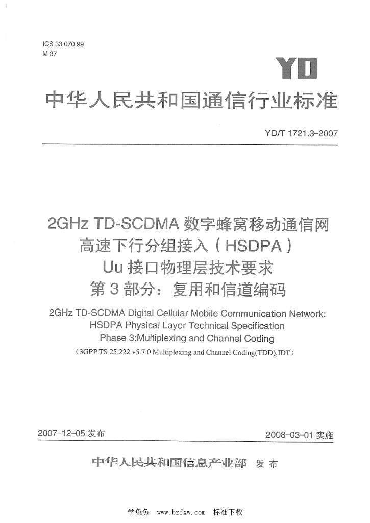 YD/T 1721.3-2007 2GHz TD-SCDMA数字蜂窝移动通信网 高速下行分组接入(HSDPA)Uu接口物理层技术要求 第3部分:复用和信道编码