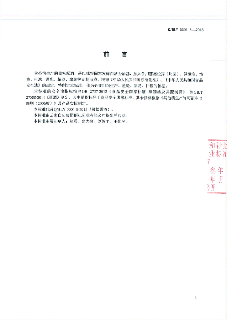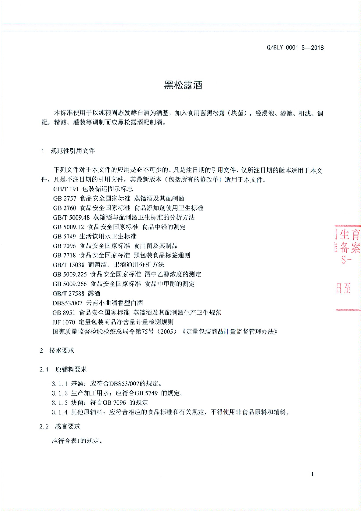 Q/BLY 0001S-2018 黑松露酒