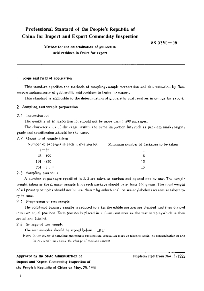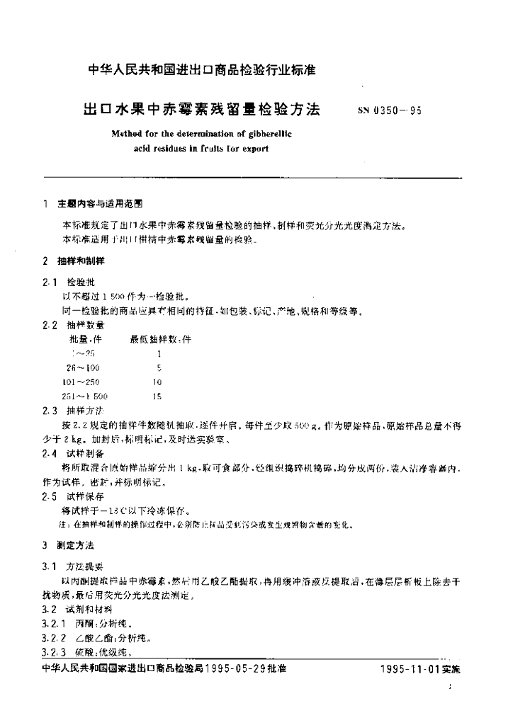SN 0350-1995 出口水果中赤霉素残留量检验方法