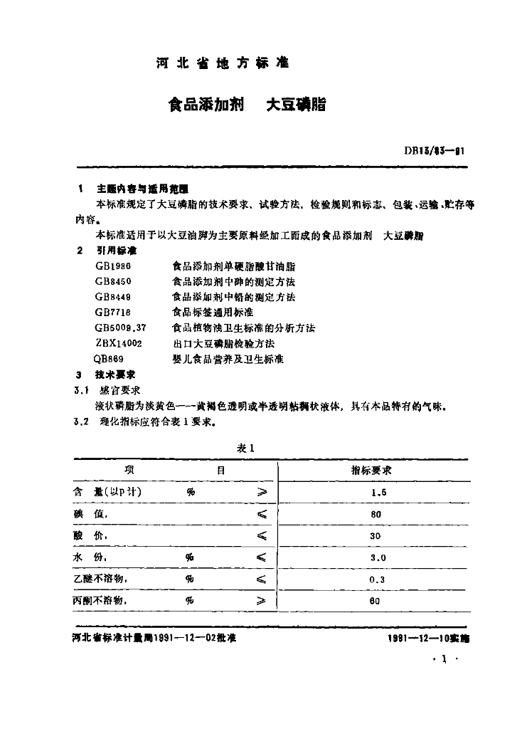 DB13/ 83-1991 食品添加剂 大豆磷脂
