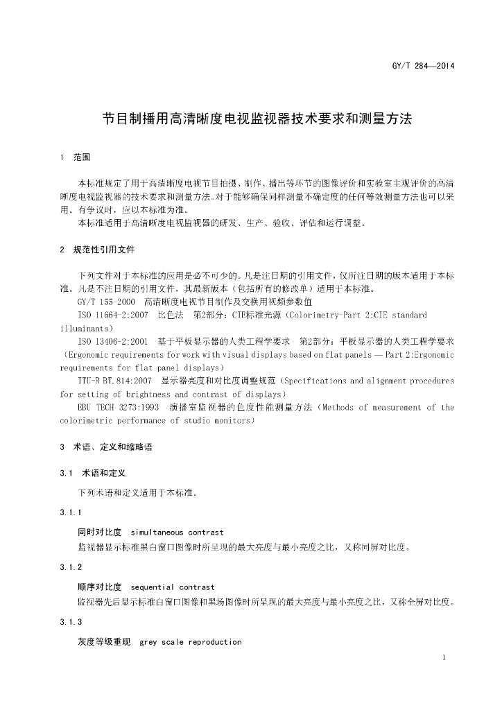 GY/T 284-2014 节目制播用高清晰度电视监视器技术要求和测量方法