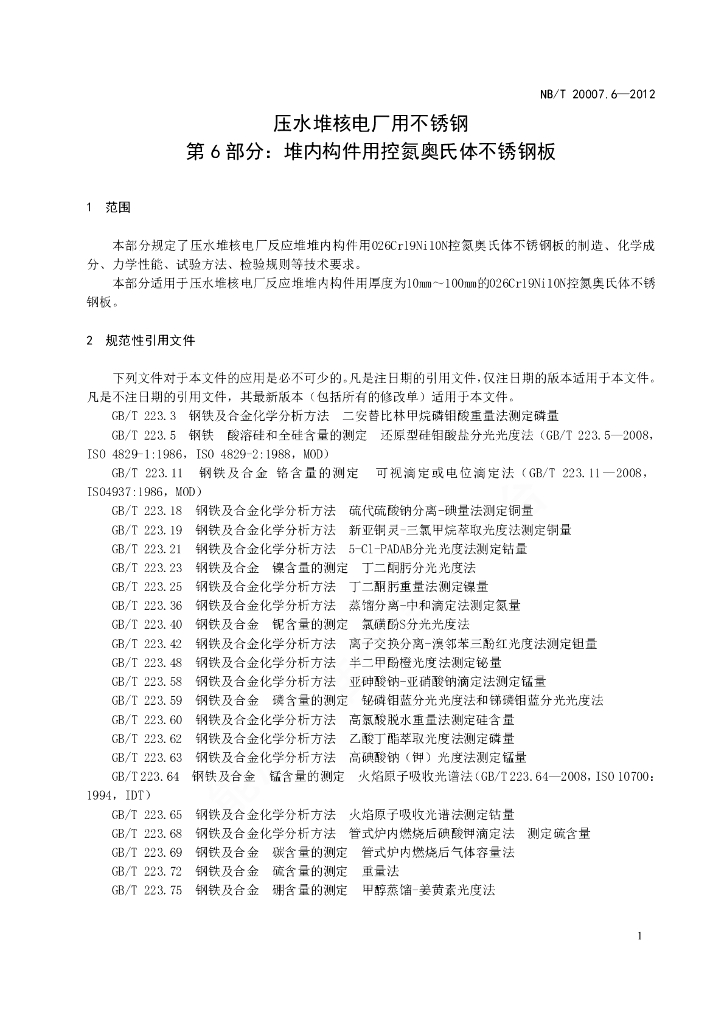 NB/T 20007.6-2012 压水堆核电厂用不锈钢 第6部分:堆内构件用控氮奥氏体不锈钢板