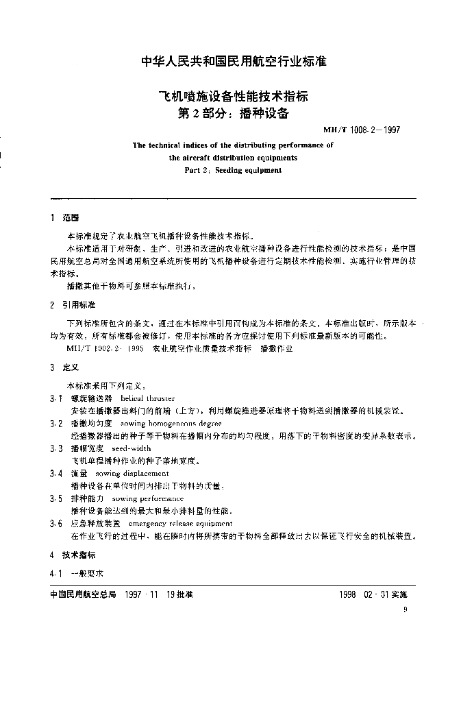 MH/T 1008.2-1997 飞机喷施设备性能技术指标 第2部分:播种设备