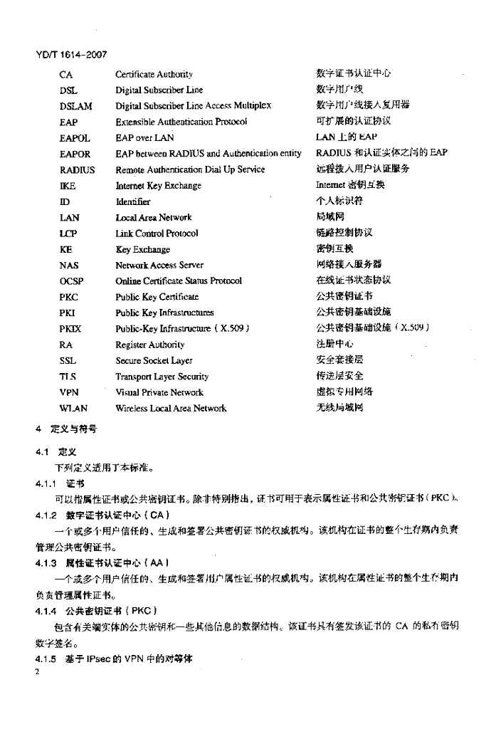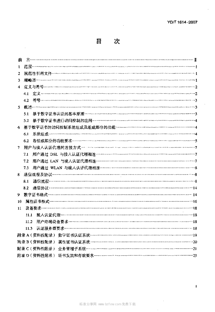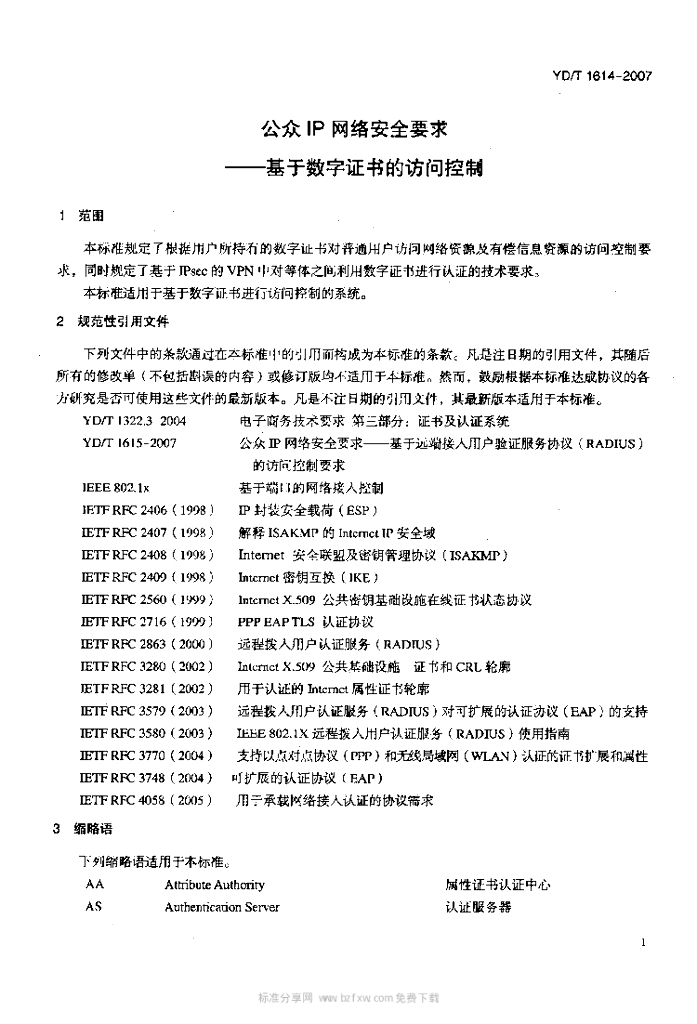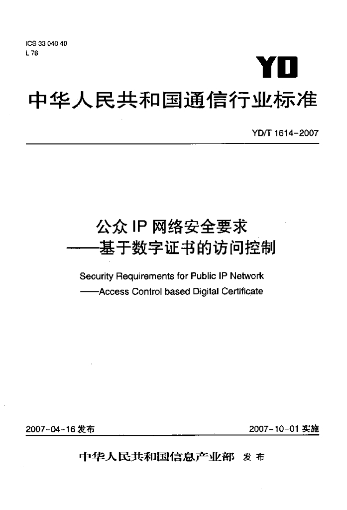 YD/T 1614-2007 公众 IP 网络安全要求基于数字证书的访问控制