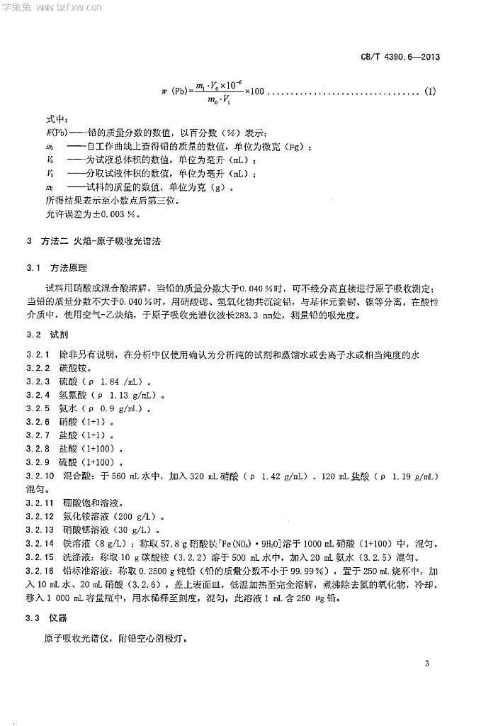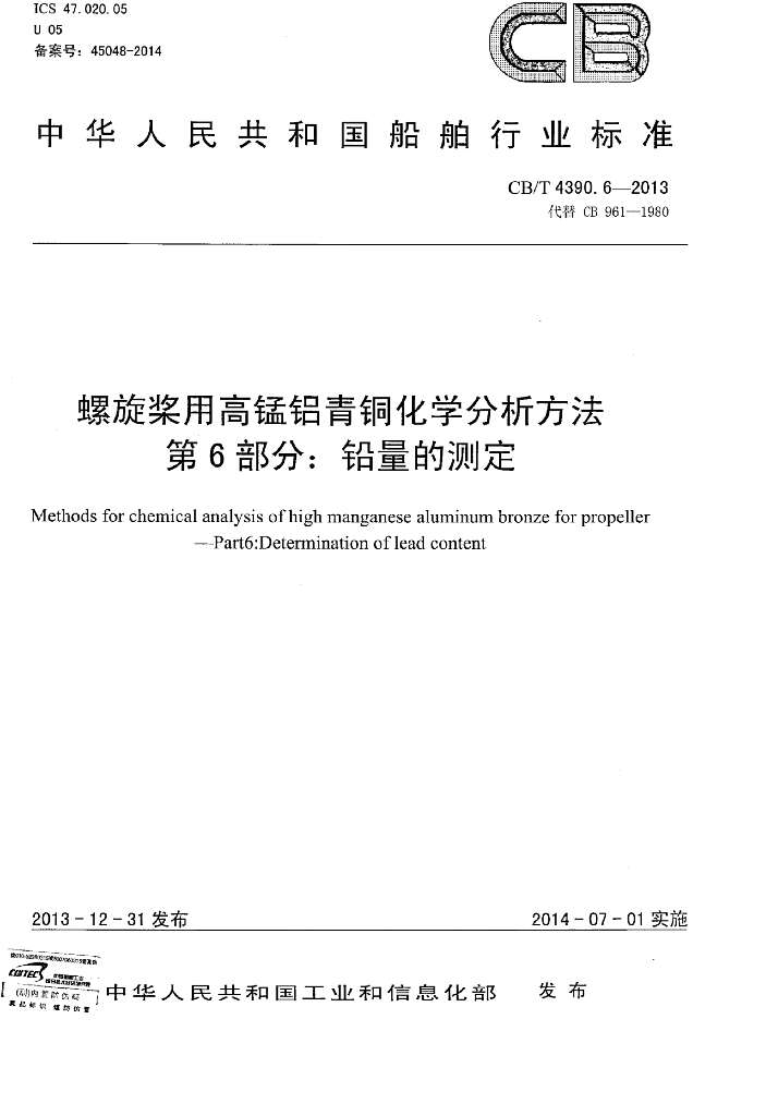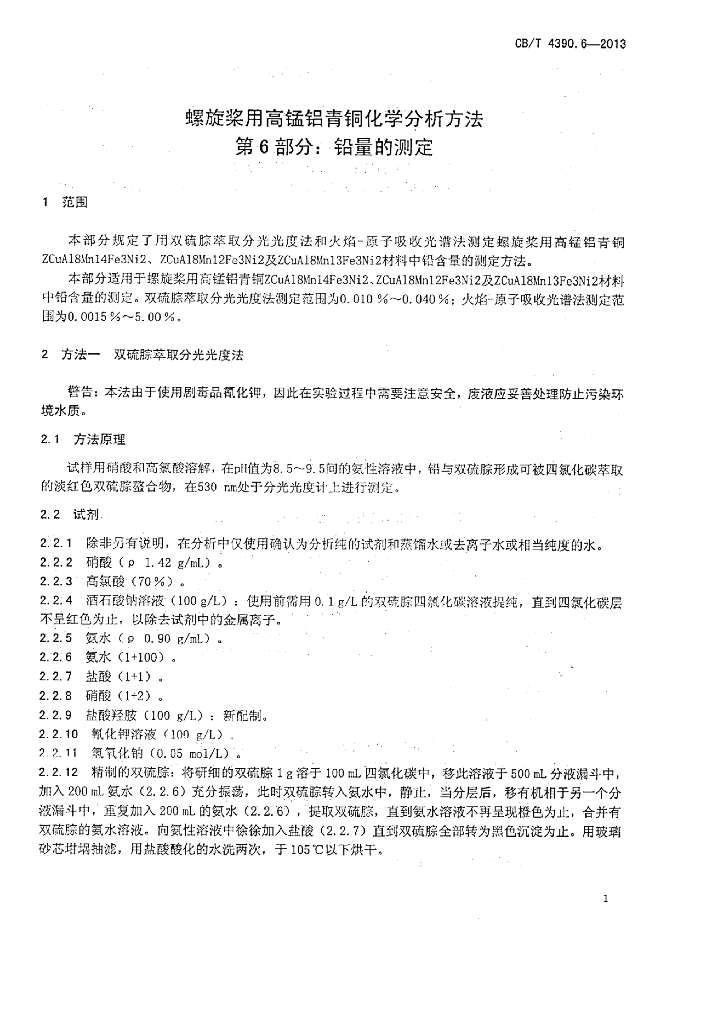 CB/T 4390.6-2013 螺旋桨用高锰铝青铜化学分析方法 第6部分:铅量的测定