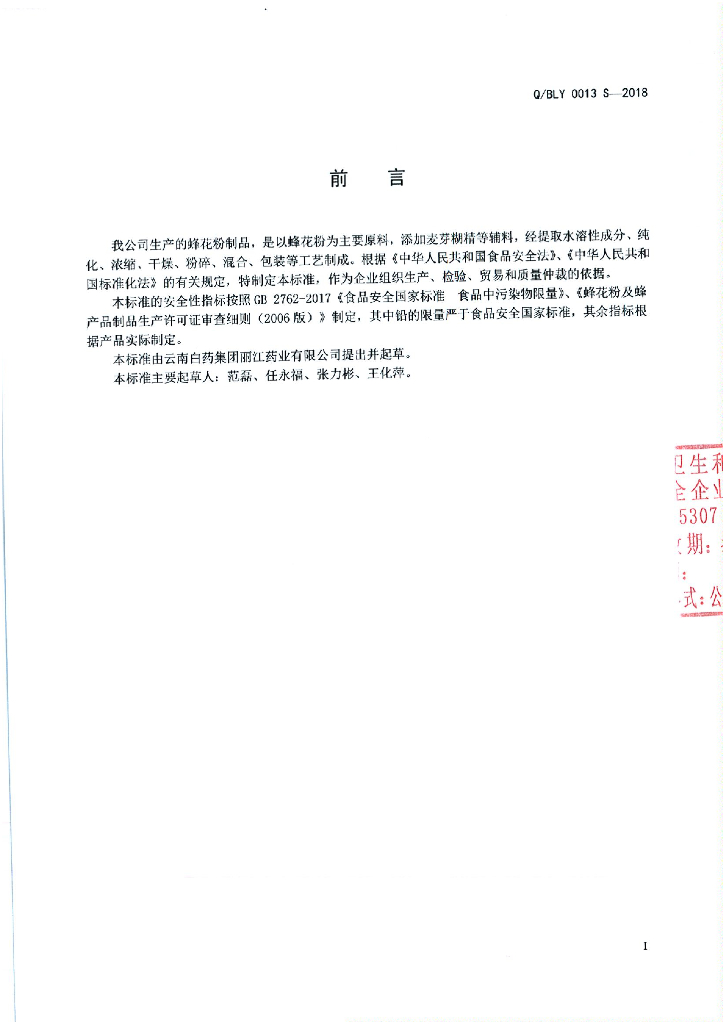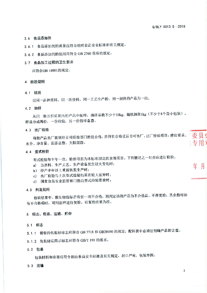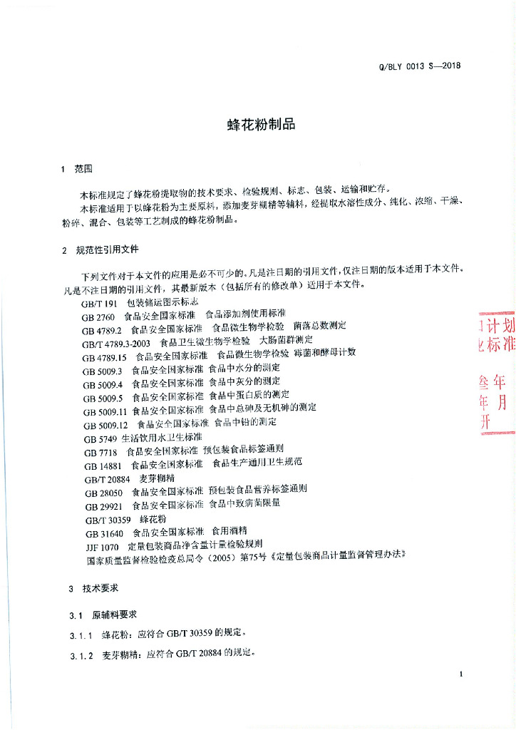 Q/BLY 0013S-2018 蜂花粉制品