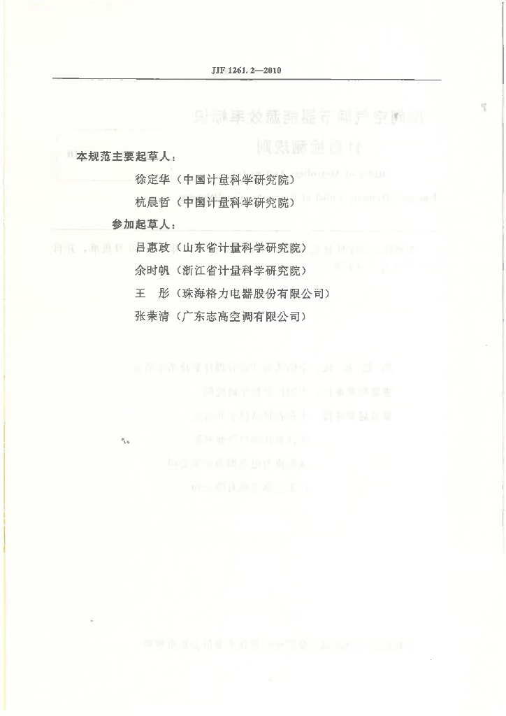 徐定华(中国计量科学研究院)、杭晨哲(中国计量科学研究院)、吕惠政(山东省计量科学研究院)、余时帆(浙江省计量科学研究院)、王彤(珠海格力电器股份有限公司)、张荣清(广东志高空调有限公司)