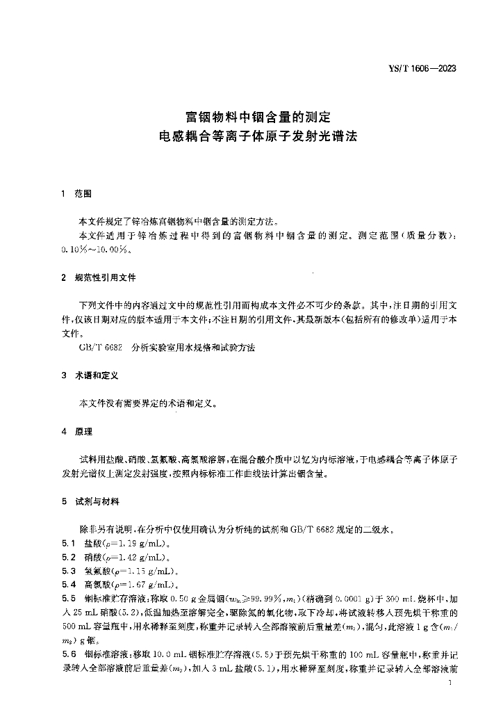 YS/T 1606-2023 富铟物料中铟含量的测定 电感耦合等离子体原子发射光谱法