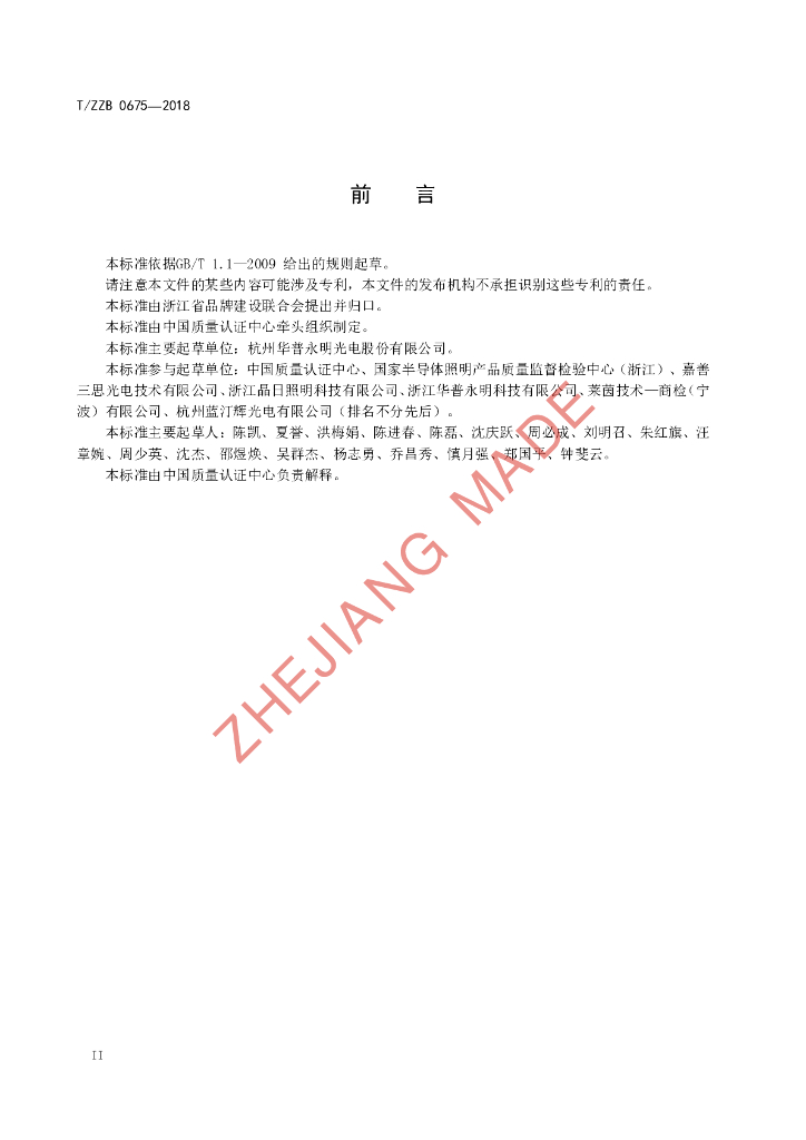 杭州华普永明光电股份有限公司、中国质量认证中心、国家半导体照明产品质量监督检验中心(浙江)、嘉善三思光电技术有限公司、浙江晶日照明科技有限公司、浙江华普永明科技有限公司、莱茵技术—商检(宁波)有限公司、杭州蓝汀辉光电有限公司