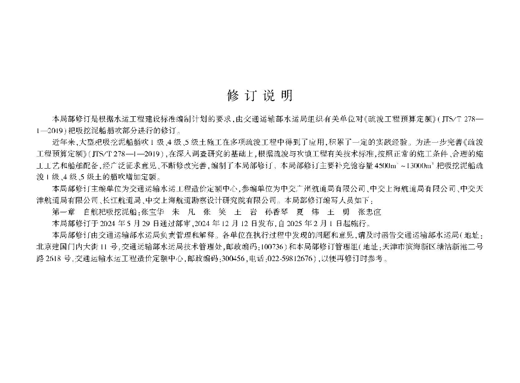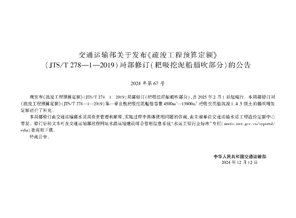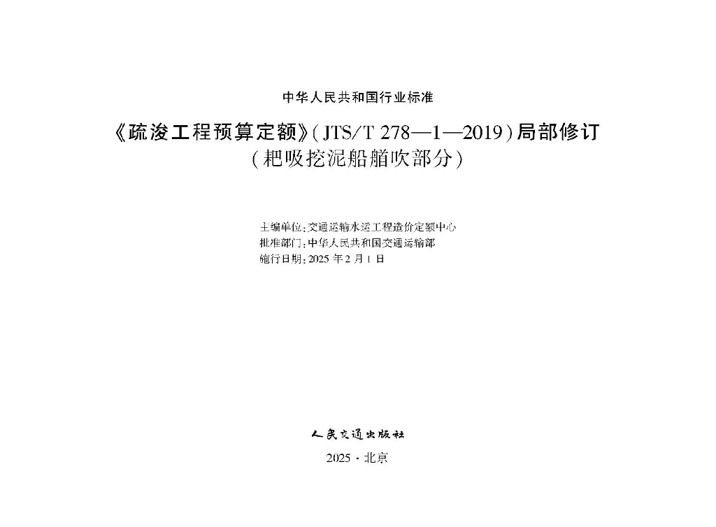 JTS/T 278-1-2019 疏浚工程预算定额局部修订(耙吸挖泥船艏吹部分)(2025局部修订条文)