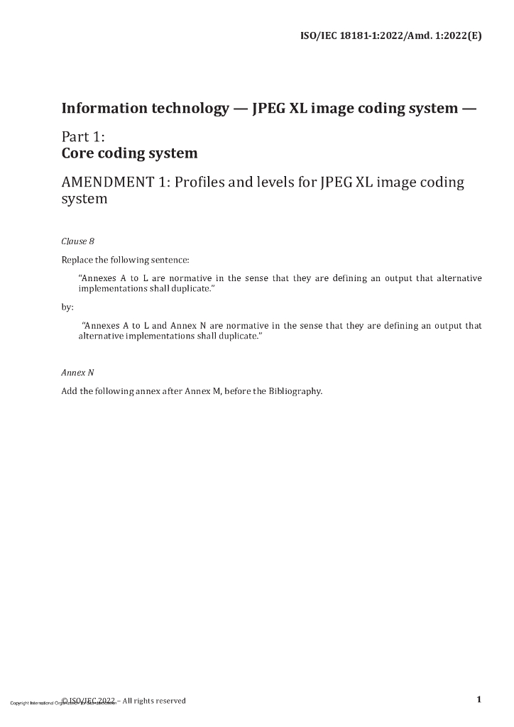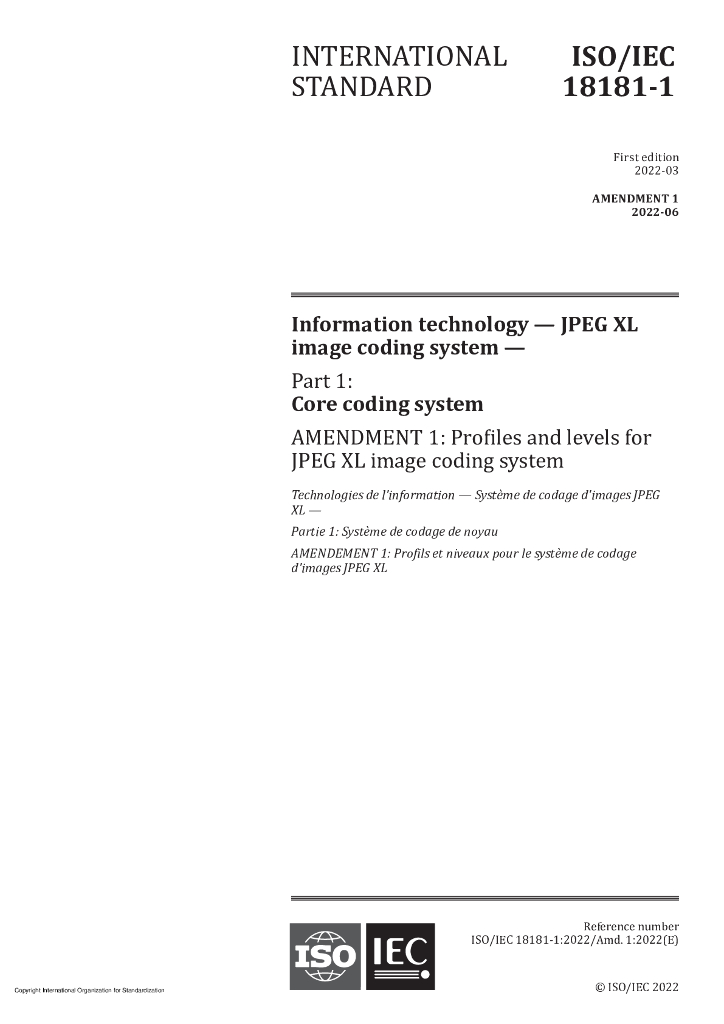 ISO/IEC 18181-1-2022/Amd 1-2022 信息技术 JPEG XL 图像编码系统 第1部分:核心编码系统 修订 1:JPEG XL 图像编码系统的配置文件和级别