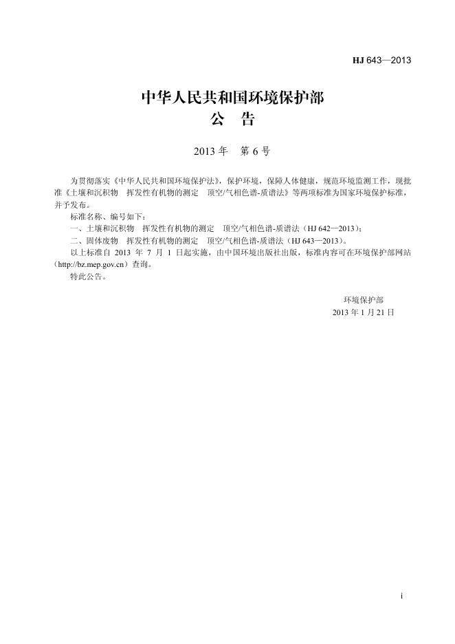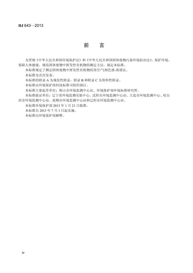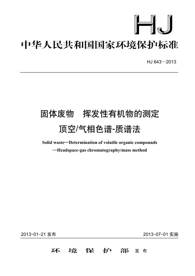 HJ 643-2013 固体废物 挥发性有机物的测定 顶空气相色谱—质谱法