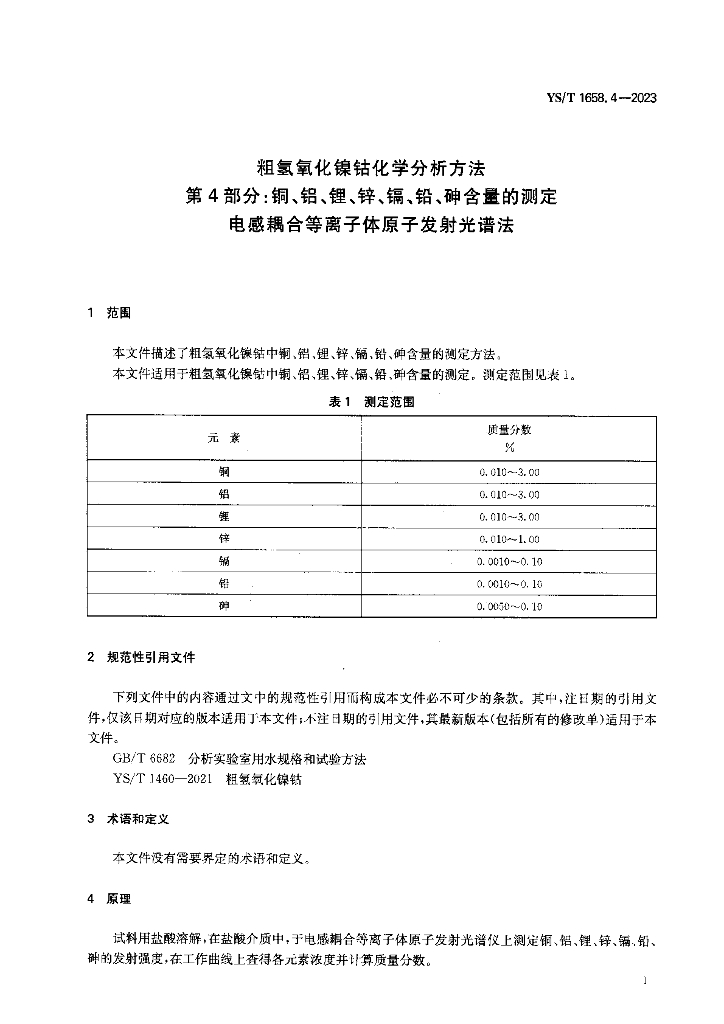 YS/T 1658.4-2023 粗氢氧化镍钴化学分析方法 第4部分:铜、铝、锂、锌、镉、铅、砷含量的测定 电感耦合等离子体原子发射光谱法
