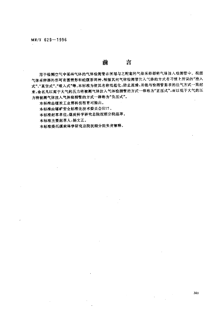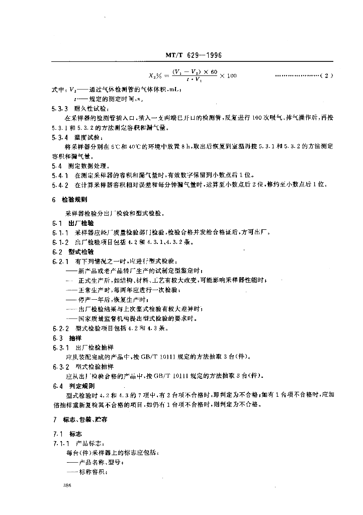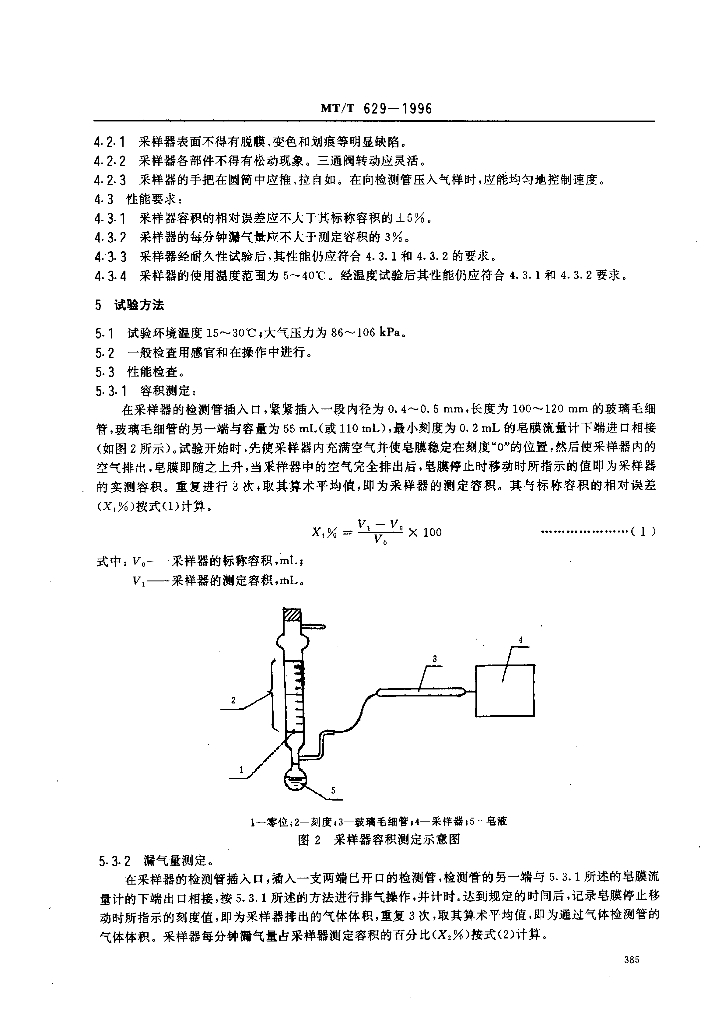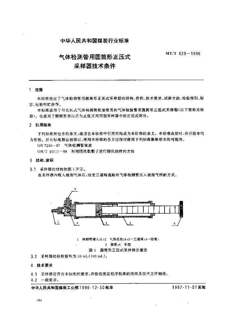 MT/T 629-1996 气体检测管用圆筒形正压式采样器技术条件
