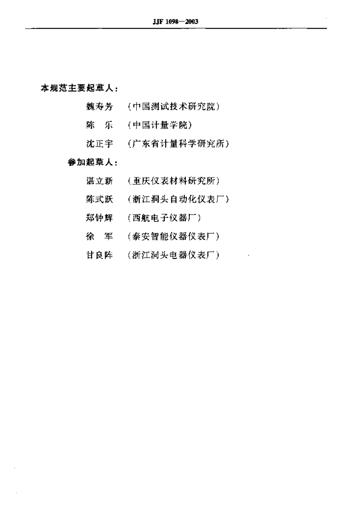 魏寿芳(中国测试技术研究院)、陈乐(中国计量学院)、沈正宇(广东省计量科学研究所)、谌立新(重庆仪表材料研究所)、陈式跃(浙江洞头自动化仪表厂)、郑钟辉(西航电子仪器厂)、徐军(泰安智能仪器仪表厂)、甘良阵(浙江洞头电器仪表厂)