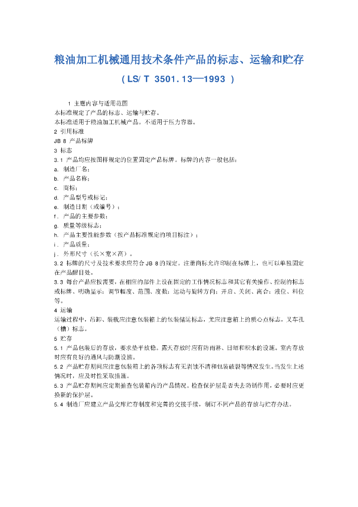 LS/T 3501.13-1993 粮油加工机械通用技术条件 产品的标志、运输和贮存