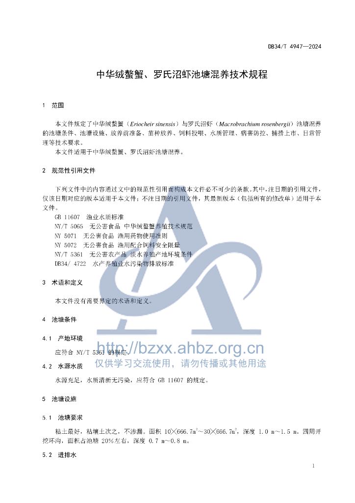 DB34/T 4947-2024 中华绒螯蟹、罗氏沼虾池塘混养技术规程