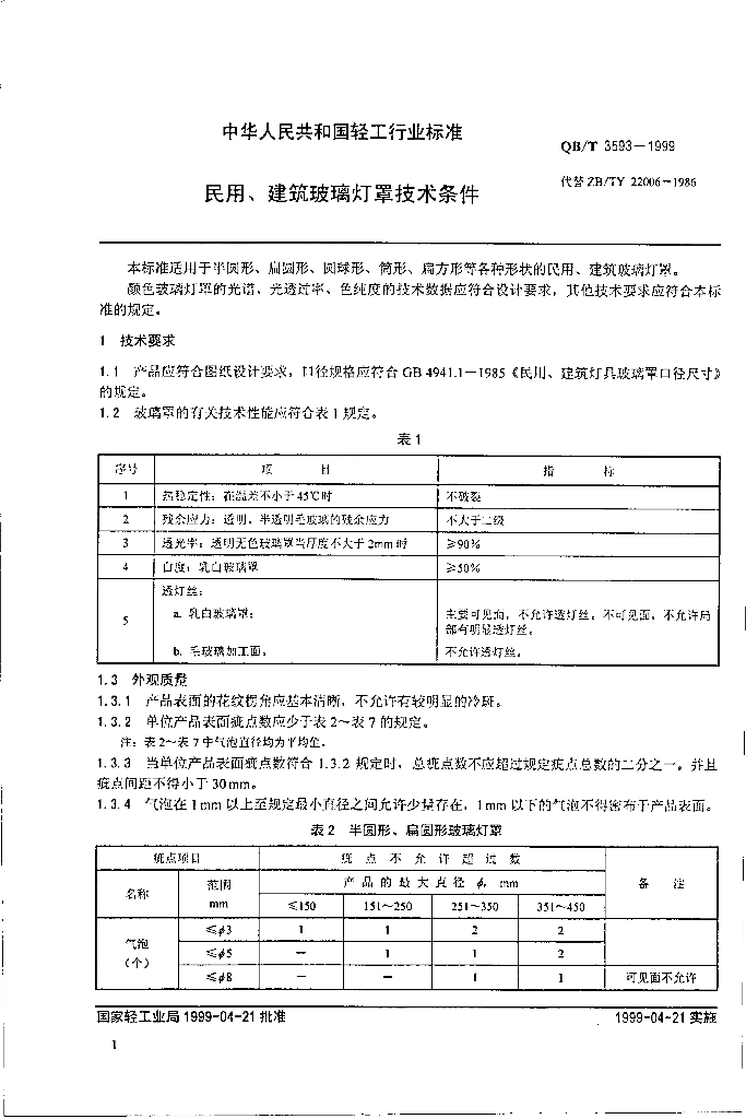 QB/T 3593-1999 民用、建筑玻璃灯罩技术条件