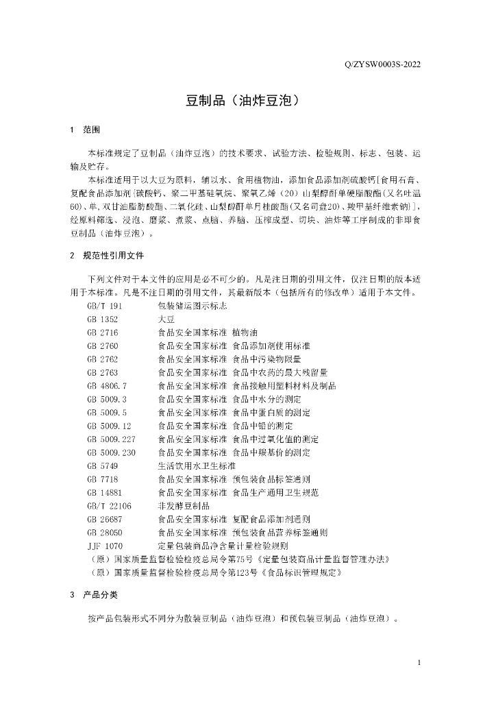 Q/ZYSW 0003S-2022 豆制品(油炸豆泡)