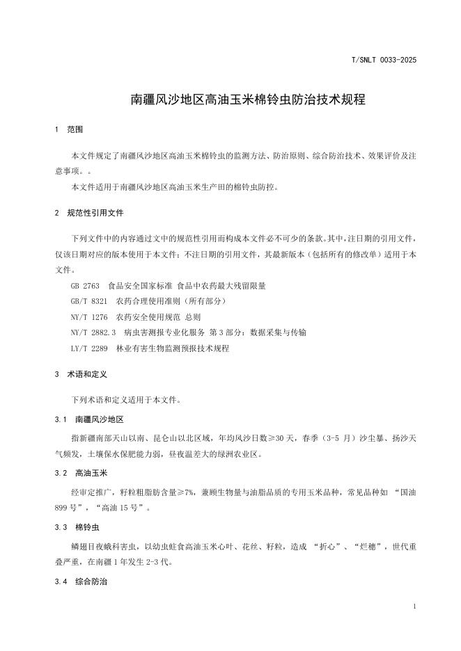 T/SNLT 0033-2025 南疆风沙地区高油玉米棉铃虫防治技术规程