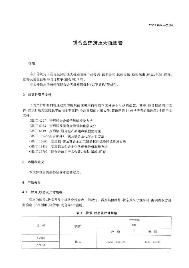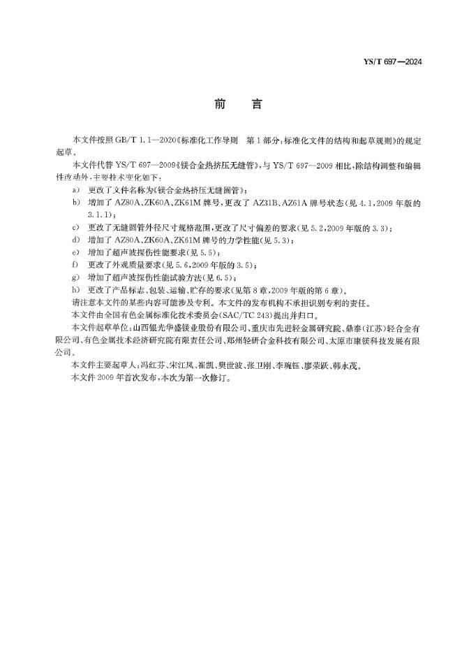 YS/T 697-2024 镁合金热挤压无缝圆管