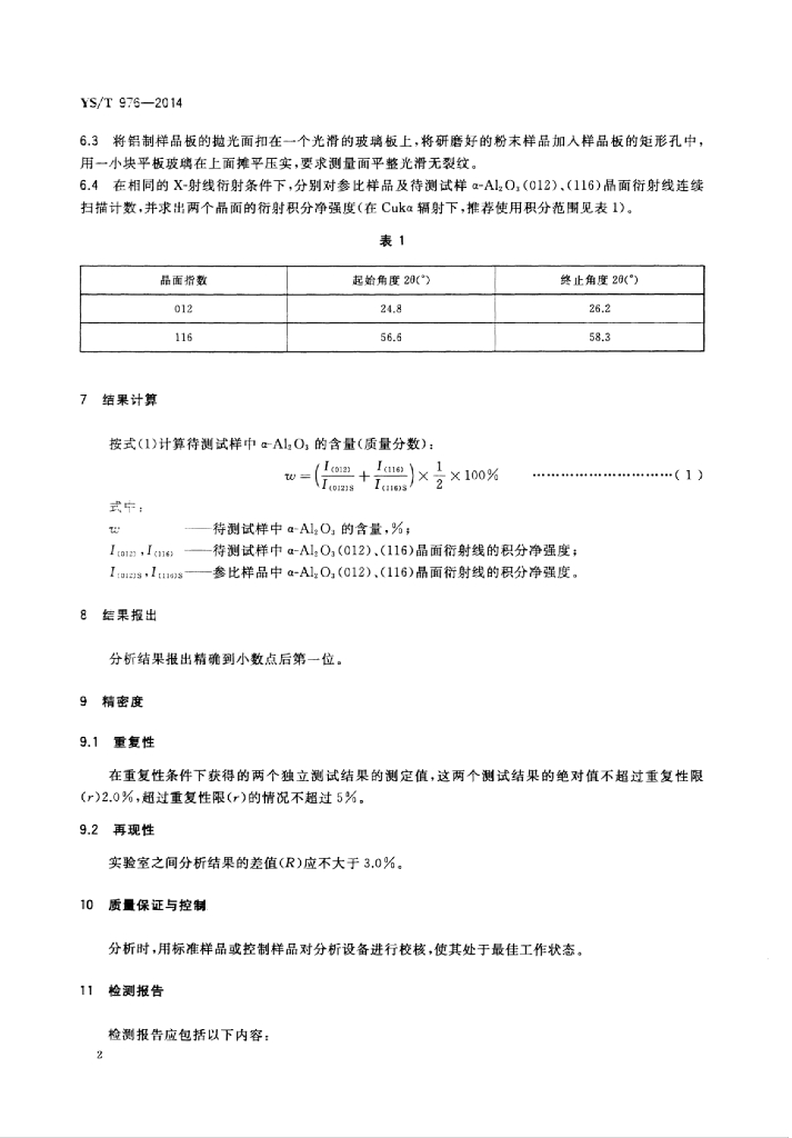 YS/T 976-2014 煅烧α型氧化铝中α-Al2O3含量的测定X-射线衍射法