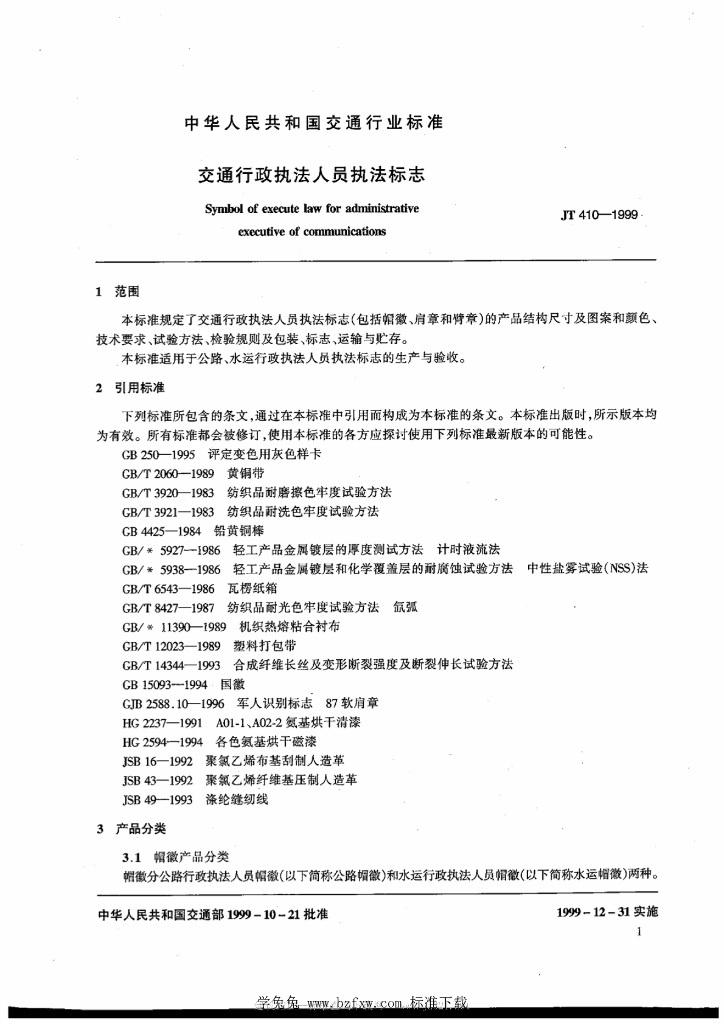 JT 410-1999 交通行政执法人员执法标志