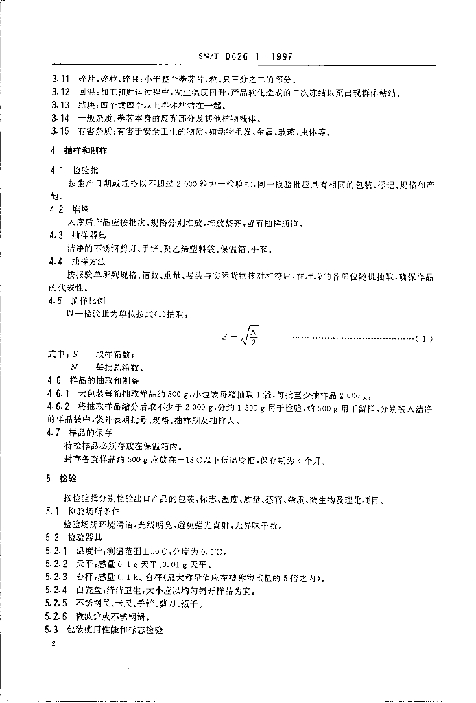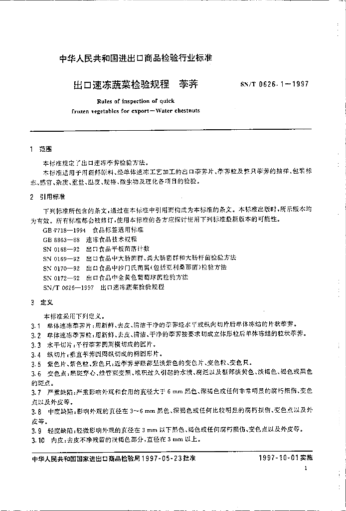 SN/T 0626.1-1997 出口速冻蔬菜检验规程 荸荠