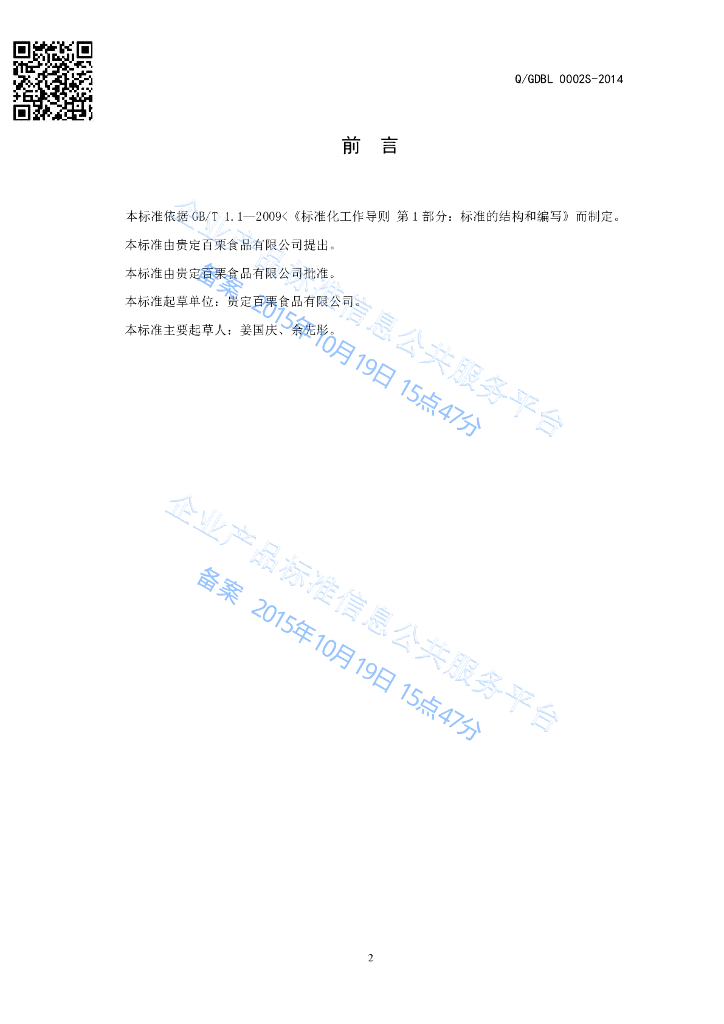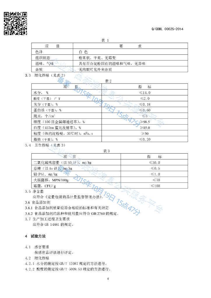 Q/GDBL 0002S-2014 贵定百栗食品有限公司 百合淀粉