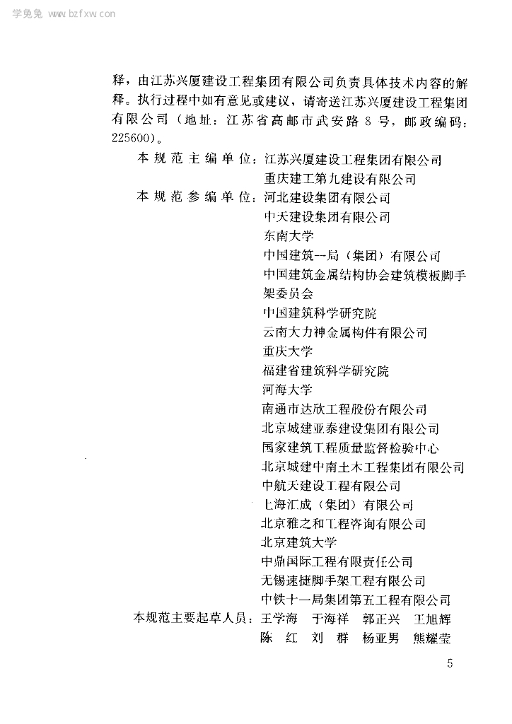 江苏兴厦建设工程集团有限公司、重庆建工第九建设有限公司、河北建设集团有限公司、中天建设集团有限公司、东南大学、中国建筑一局(集团)有限公司、中国建筑金属结构协会建筑模板脚手架委员会、中国建筑科学研究院、云南大力神金属构件有限公司、重庆大学、福建省建筑科学研究院、河海大学、南通市达欣工程股份有限公司、北京城建亚泰建设集团有限公司、国家建筑工程质量监督检验中心、北京城建中南土木工程集团有限公司、中航天建设工程有限公司、上海汇成(集团)有限公司、北京雅之和工程咨询有限公司、北京建筑大学、中鼎国际工程有限责任公司