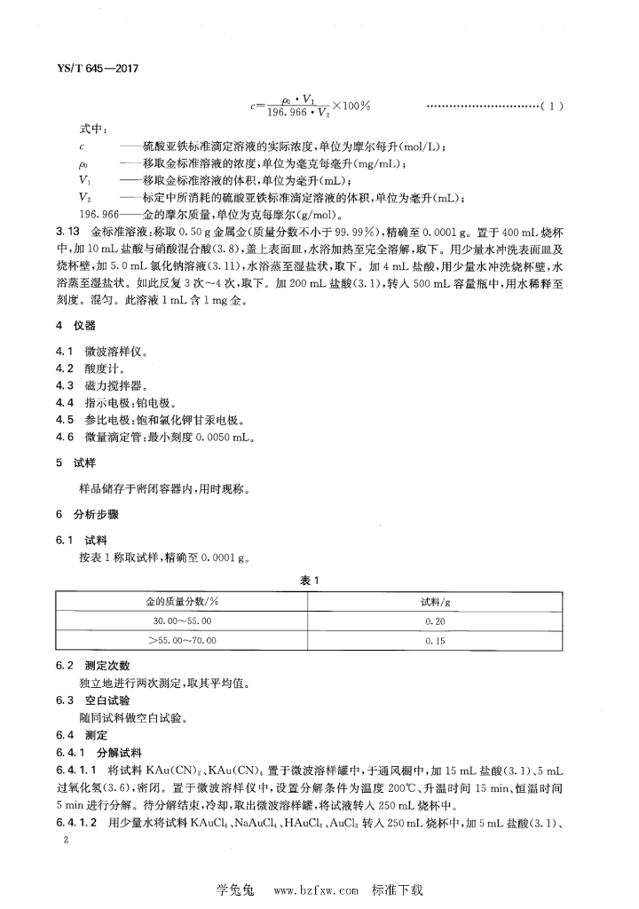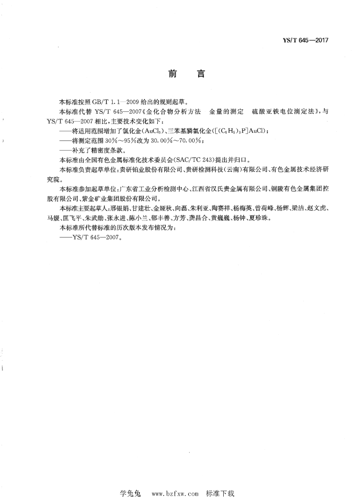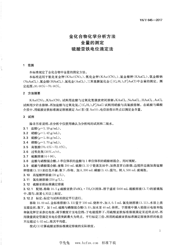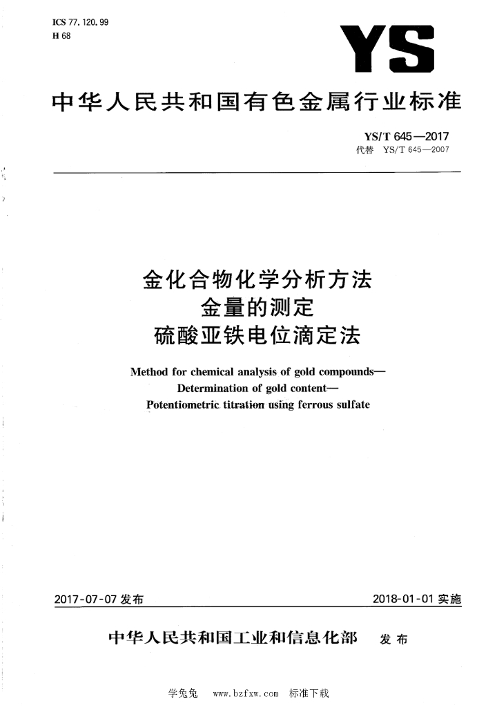 YS/T 645-2017 金化合物化学分析方法 金量的测定 硫酸亚铁电位滴定法