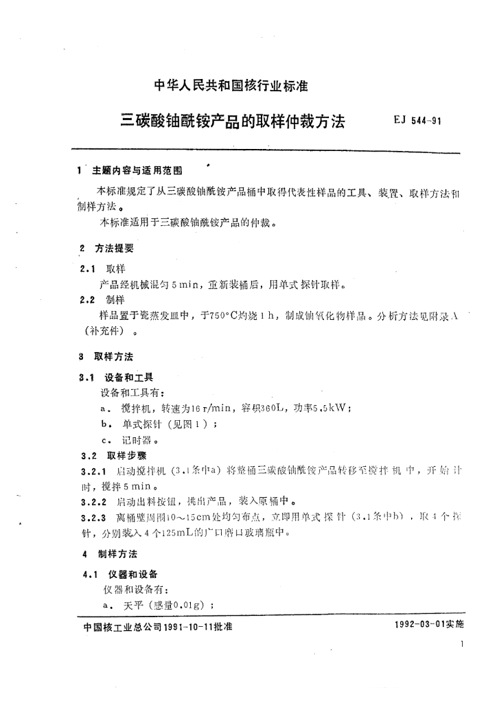 EJ/T 544-1991 三碳酸铀酰铵产品的取样仲裁方法