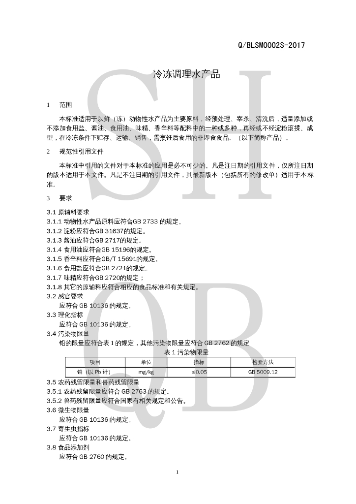 Q/BLSM 0002S-2017 冷冻调理水产品