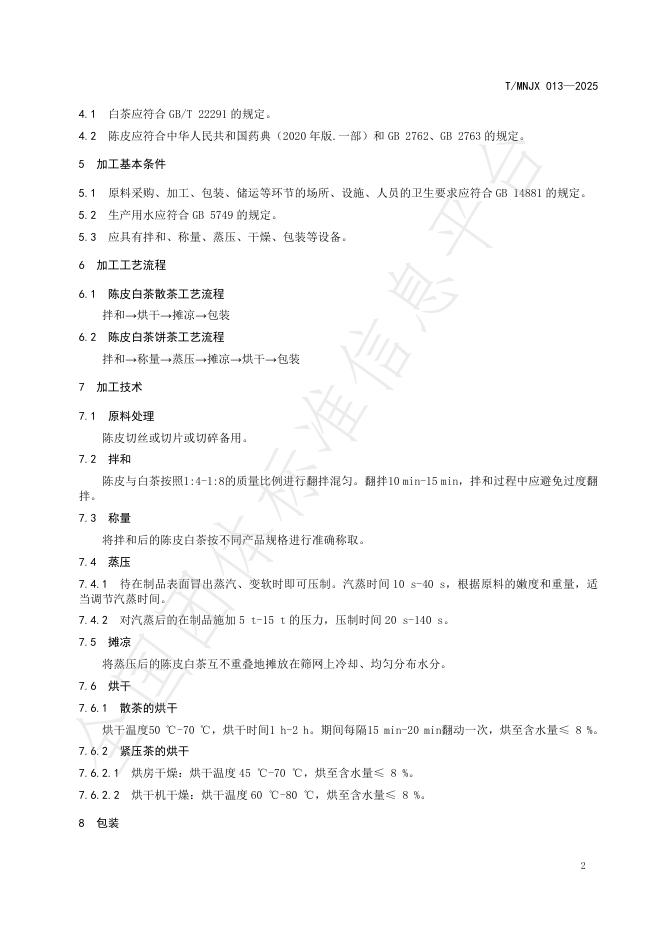 T/MNJX 013-2025 陈皮白茶加工技术规程