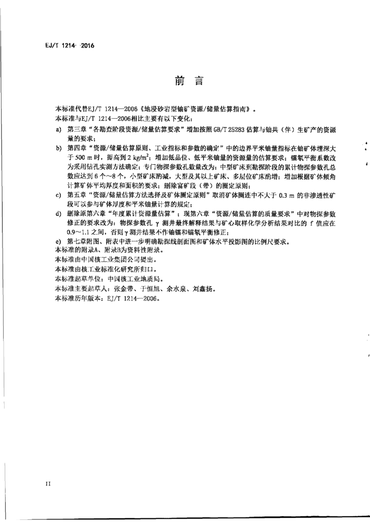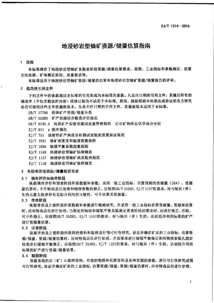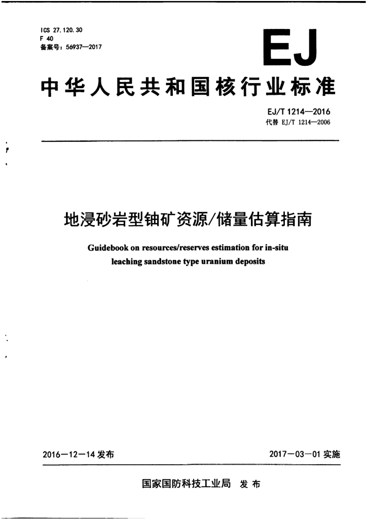 EJ/T 1214-2016 地浸砂岩型铀矿资源储量估算指南