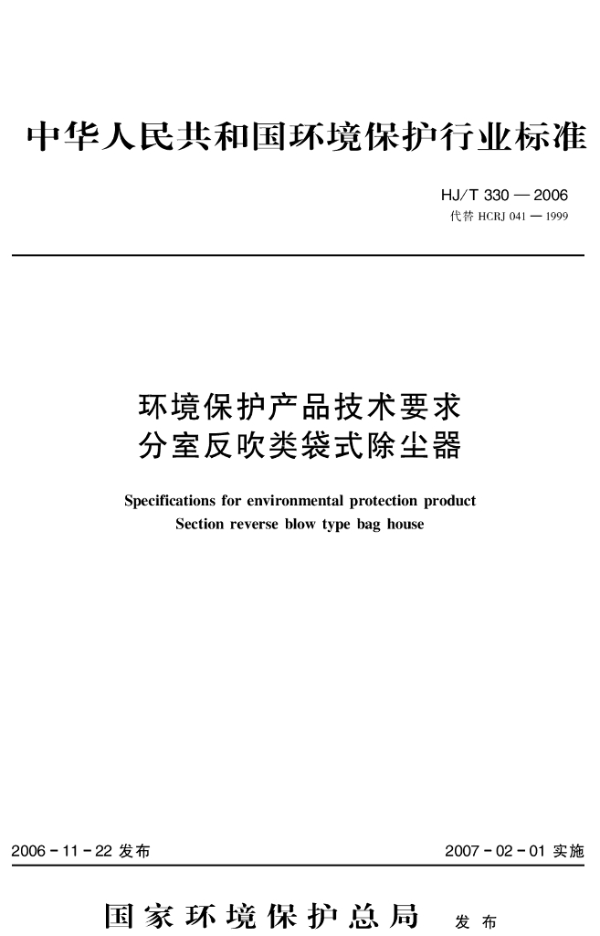 HJ/T 330-2006 环境保护产品技术要求 分室反吹类袋式除尘器