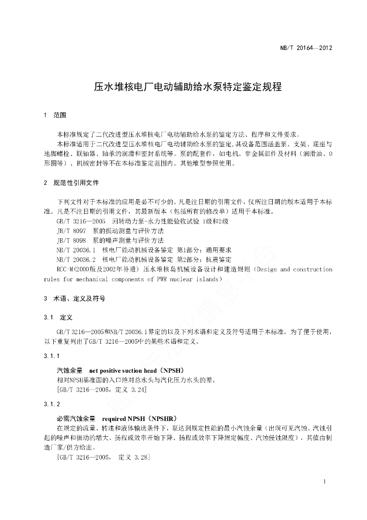 NB/T 20164-2012 压水堆核电厂电动辅助给水泵特定鉴定规程