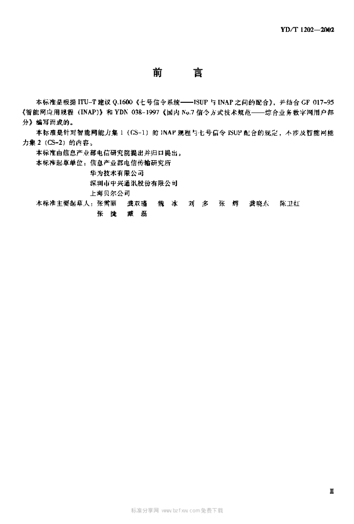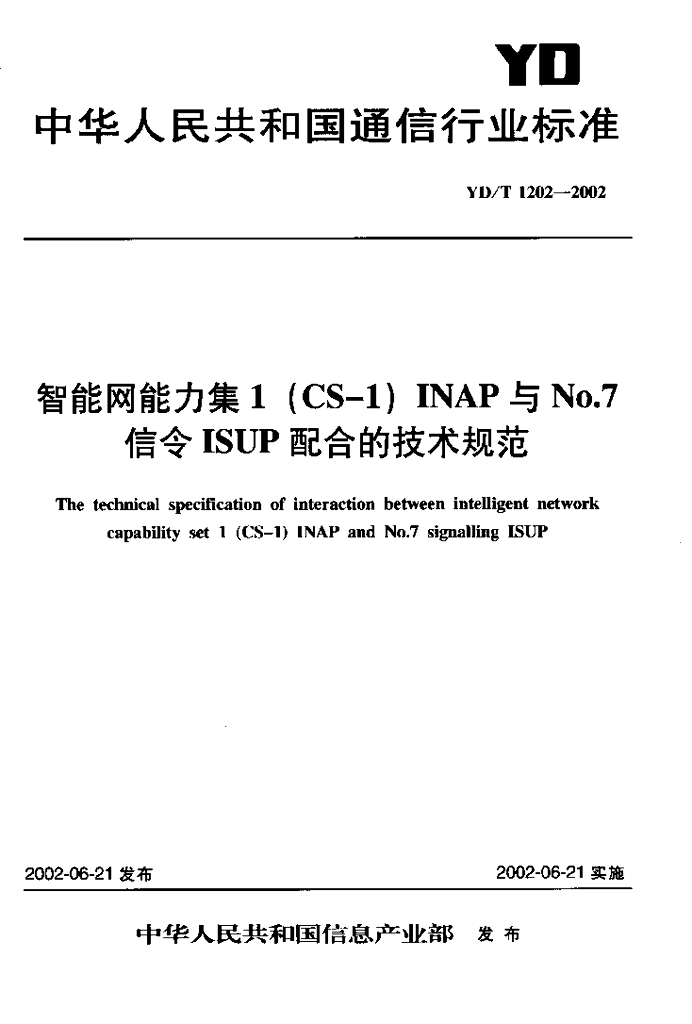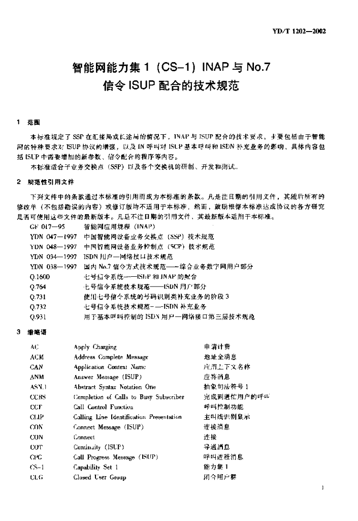YD/T 1202-2002 智能网能力集1(CS-1) INAP 与 No.7 信令 ISUP 配合的技术规范