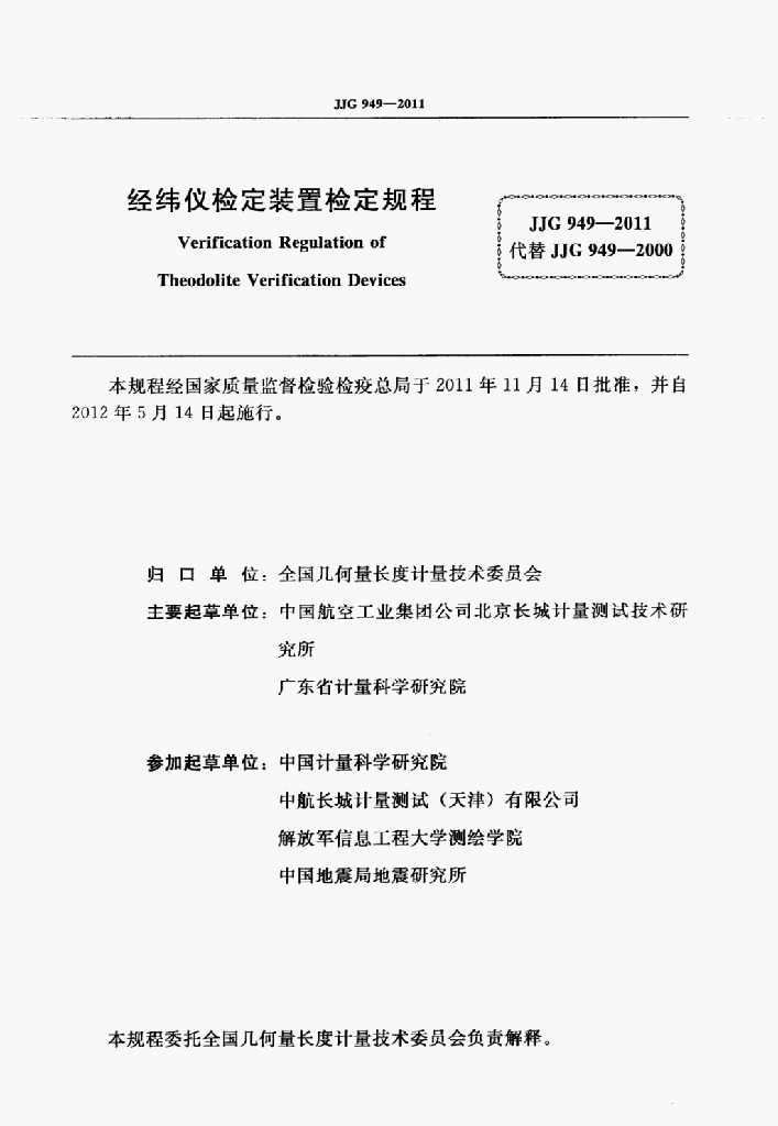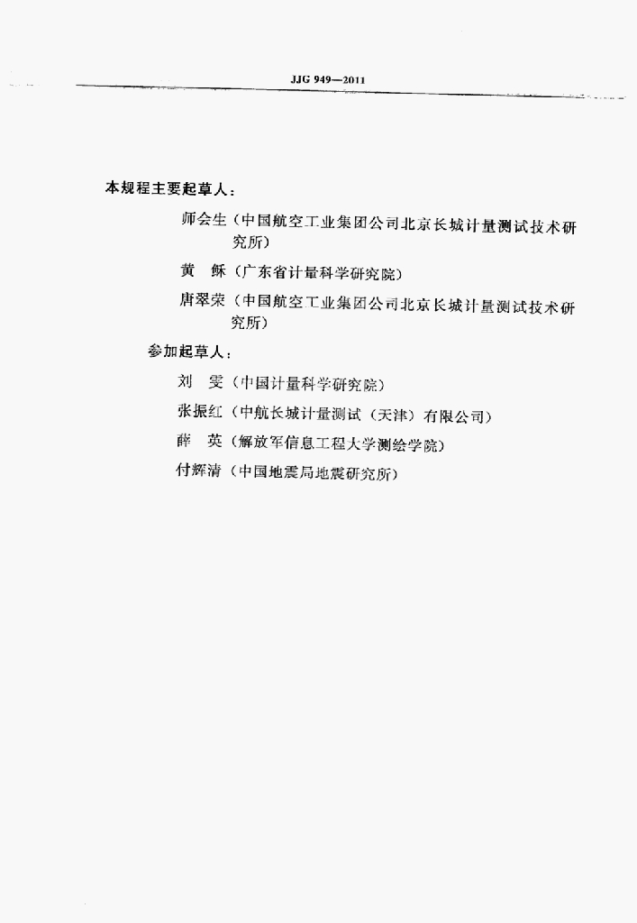 师会生(中国航空工业集团公司北京长城计量测试技术研究所)、黄稣(广东省计量科学研究院)、唐翠荣(中国航空工业集团公司北京长城计量测试技术研究所)、刘雯(中国计量科学研究院)、张振红(中航长城计量测试(天津)有限公司)、薛英(解放军信息工程大学测绘学院)、付辉清(中国地震局地震研究所)