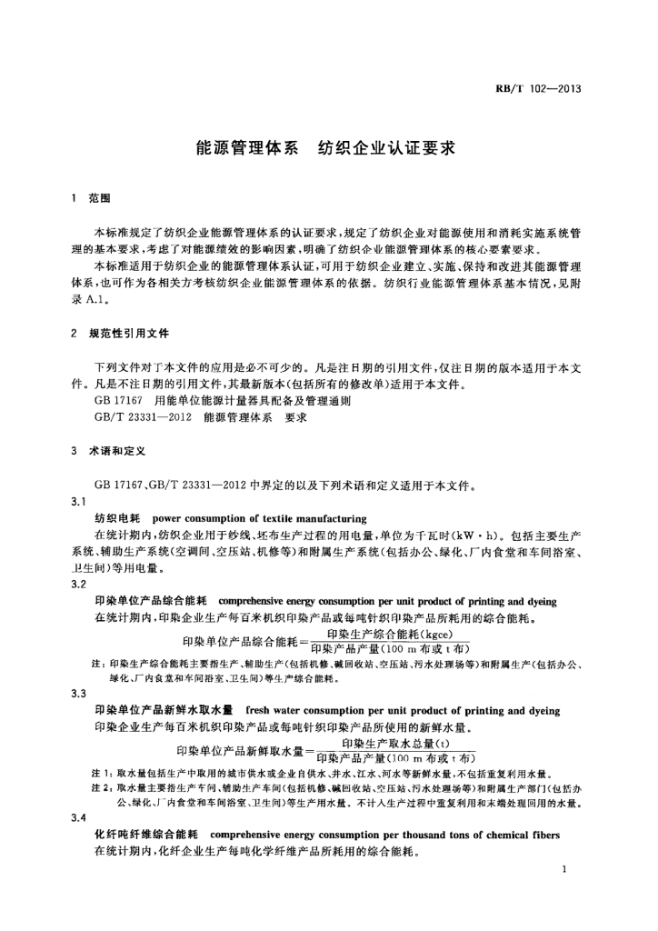 RB/T 102-2013 能源管理体系 纺织企业认证要求