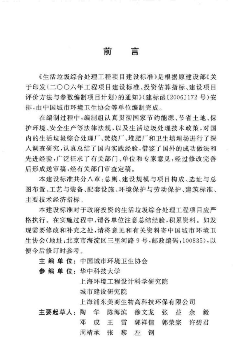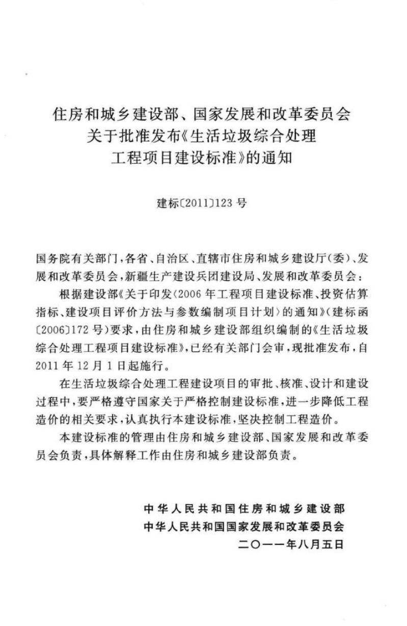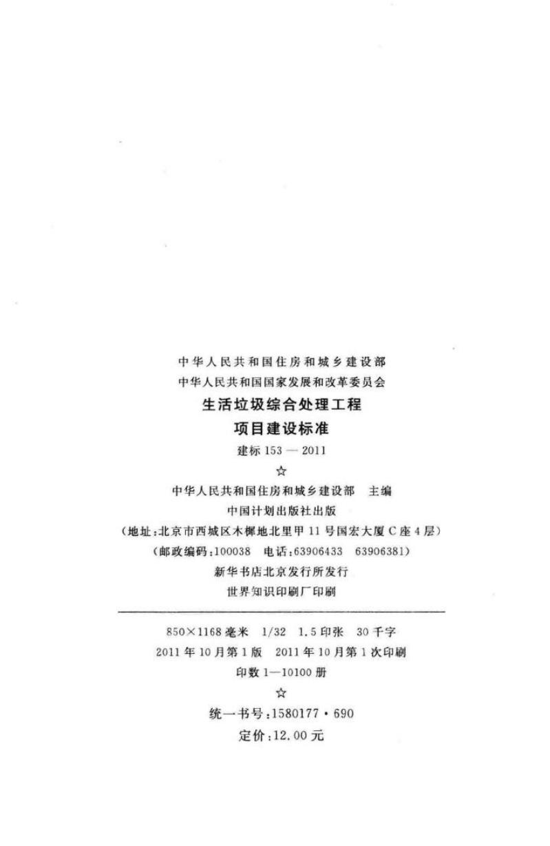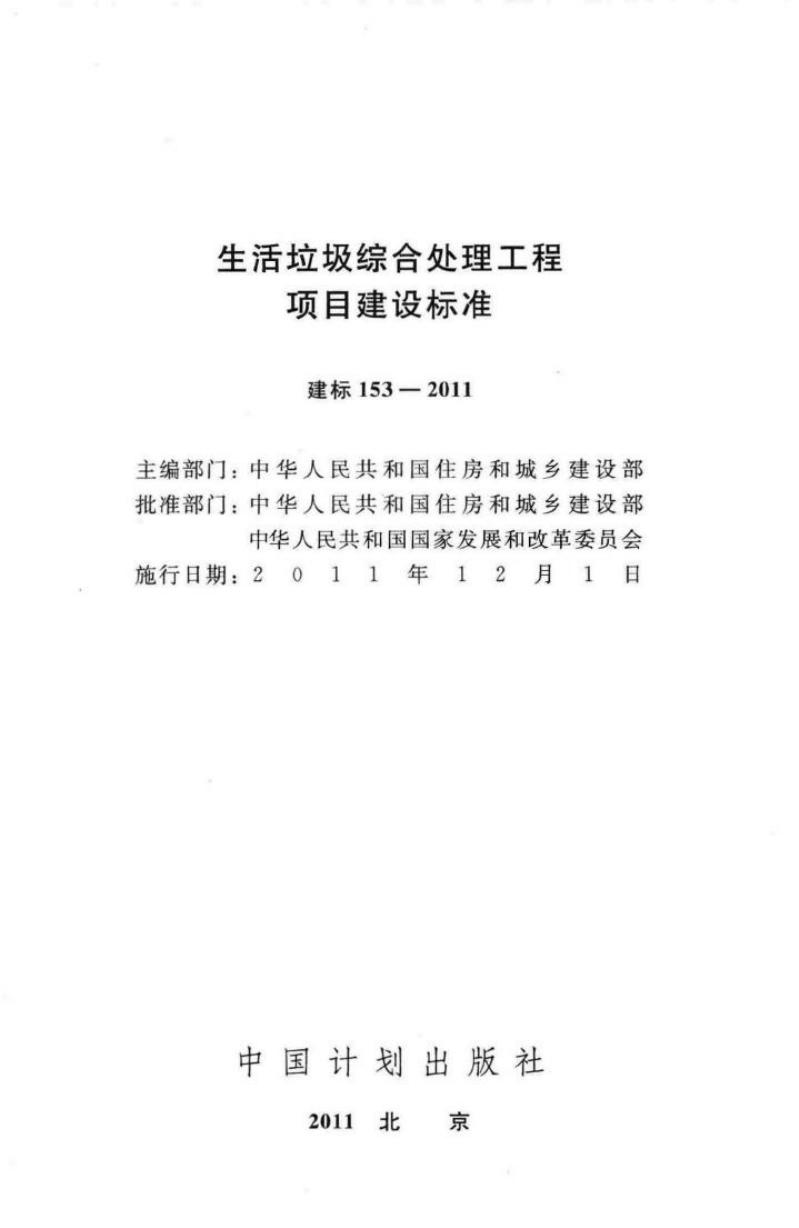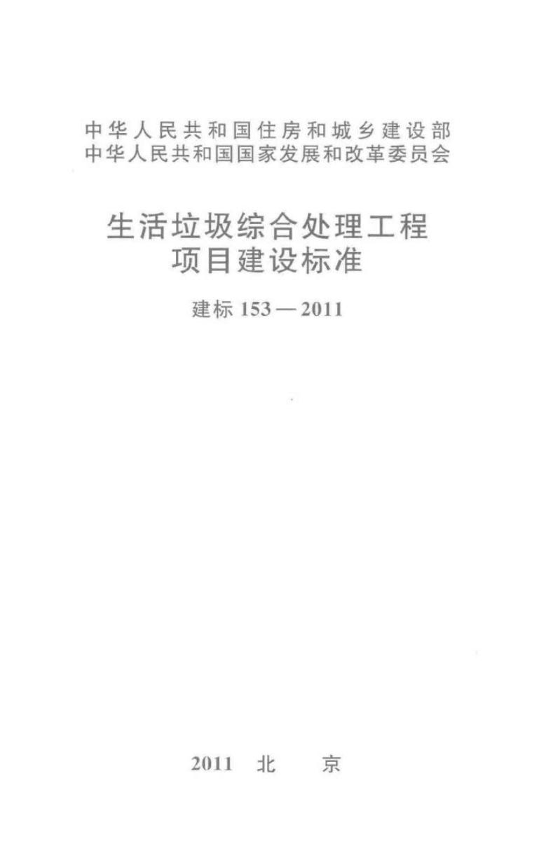 建标 153-2011 生活垃圾综合处理工程项目建设标准