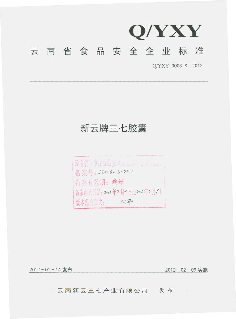 Q/YXY 0003S-2012 新云牌三七胶囊