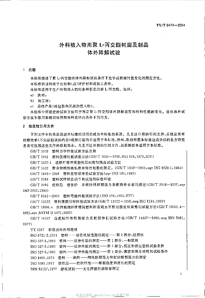 YY/T 0474-2004 外科植入物用聚L-丙交酯树脂及制品体外降解试验