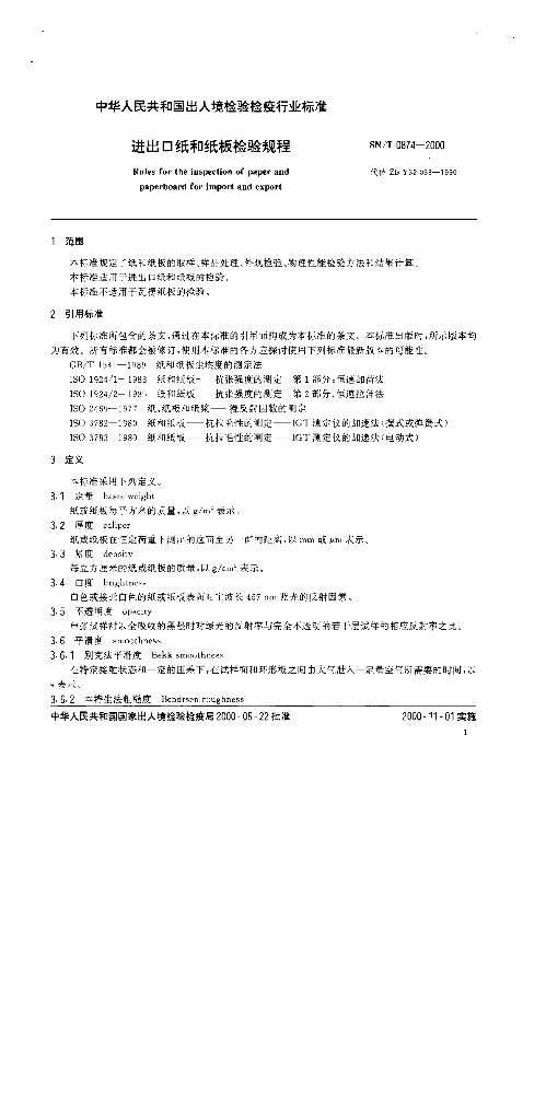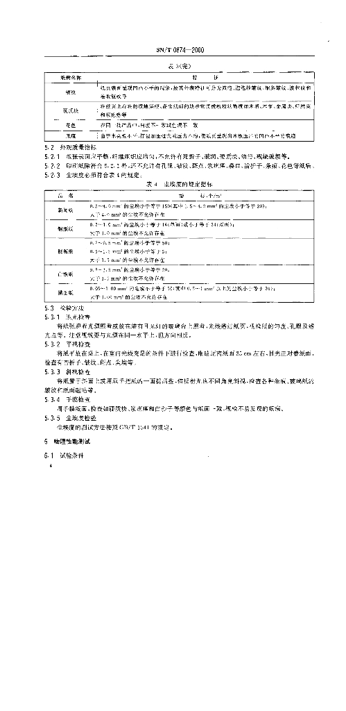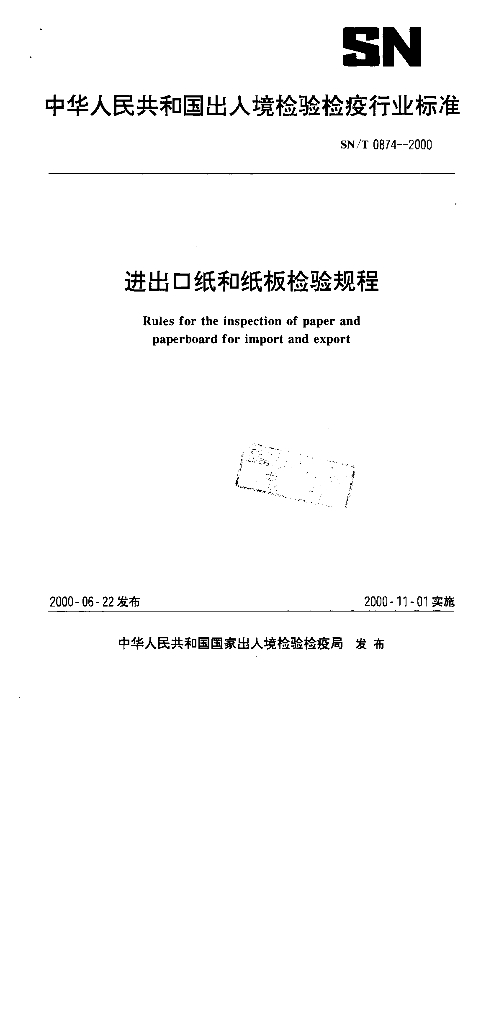 SN/T 0874-2000 进出口纸和纸板检验规程
