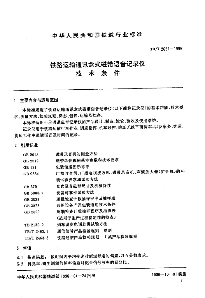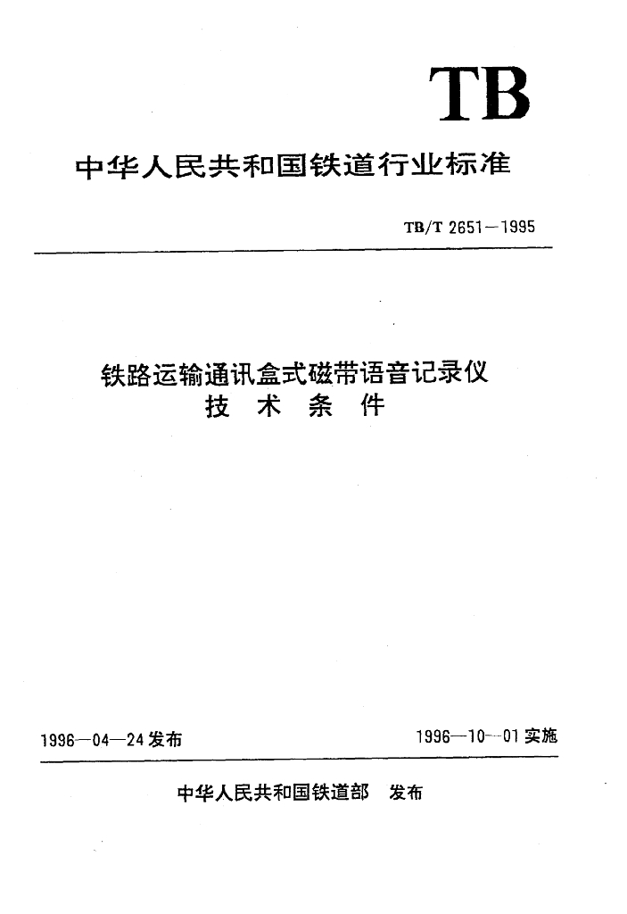 TB/T 2651-1995 铁路运输通讯盒式磁带语音记录仪技术条件