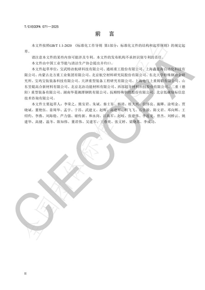 宝武特冶航研科技有限公司、通裕重工股份有限公司、上海鑫蓝海自动化科技有限公司、内蒙古北方重工业集团有限公司、北京航空材料研究院股份有限公司、东北大学特殊钢冶金研究所、宝鸡宝钛装备科技有限公司、天津重型装备工程研究有限公司、上海电气上重铸锻有限公司、山东昱锟高合新材料有限公司、北京北冶功能材料有限公司、西部超导材料科技股份有限公司、二重(德阳)重型装备有限公司、湖南华菱湘潭钢铁有限公司、抚顺特殊钢铁股份有限公司、北京低碳绿标信息技术咨询有限公司