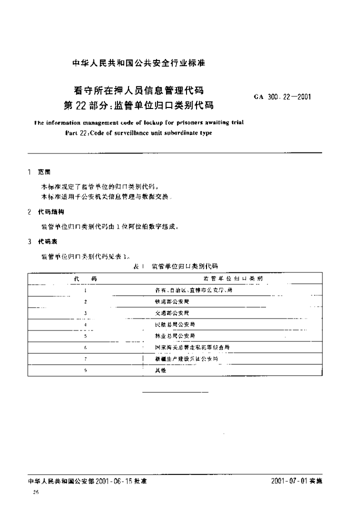 GA 300.22-2001 看守所在押人员信息管理代码 第22部分:监管单位归口类别代码