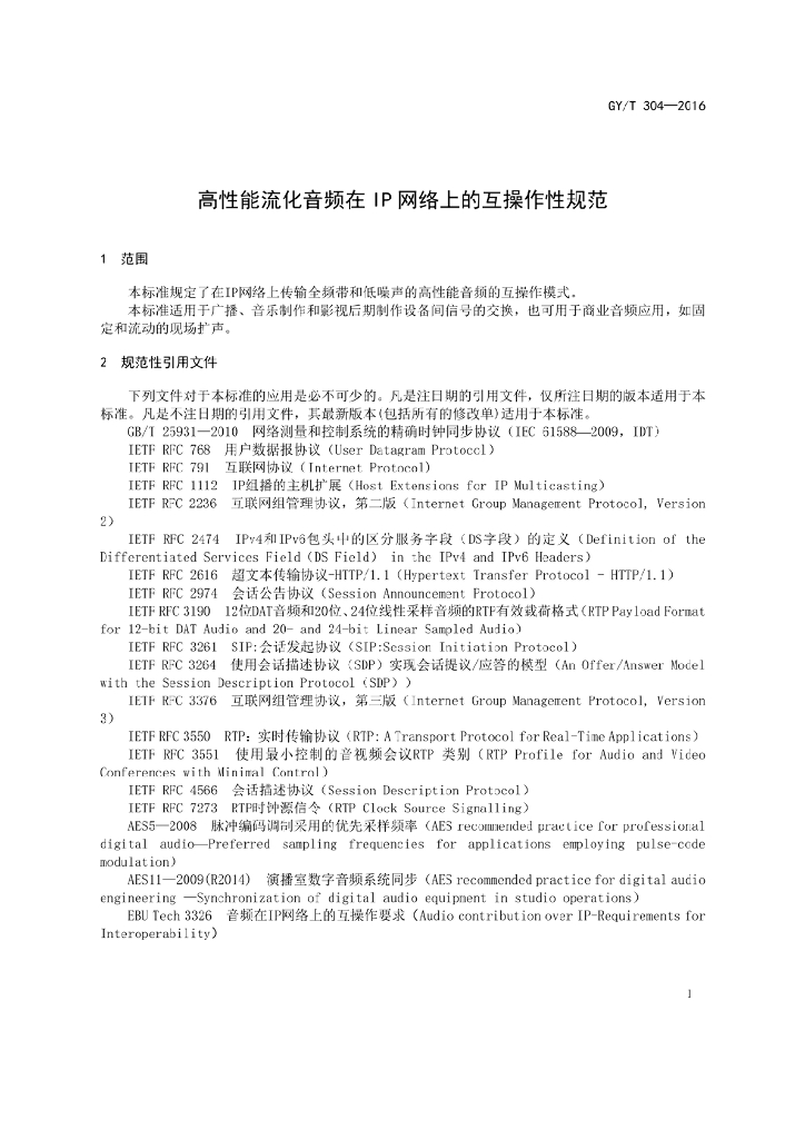 GY/T 304-2016 高性能流化音频在IP网络上的互操作性规范